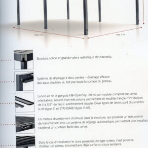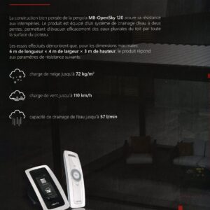 La pergola MB Open Sky 120 assure une grande résistance au intempéries. Le système est équipé de système de drainage d’eau à deux pentes. La pergola peut supporter une charge de neige jusqu’à 72 Kg/m2 / un Vent jusqu’à 110 Km/h et une capacité de drainage de l’eau jusqu’à 57 l/min.