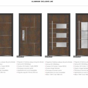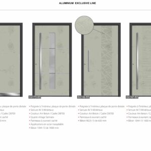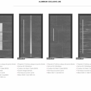 Porte d’Entrée Aluminium Exclusive line avec poignée à l’intérieur. Serrure multipoints. Vitrage de 44 mm. Panneau isolant 95 mm. Panneau aluminium résistant à l’eau et au UV. Plusieurs coloris et options d’accès disponibles. Merci de nous préciser la référence. Dispo également en PVC