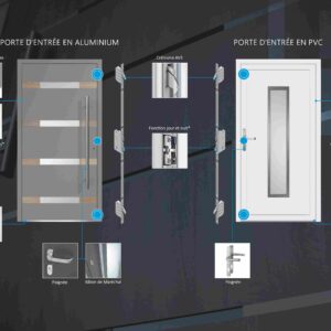 Porte PVC Classic avec système de 6 chambres en 82 mm. Seuil thermique. Panneau de Polyuréthane de 44 mm avec triple vitrages, verre satiné. Vérouillage automatique à 3 points ou 5 points en option . Charnière SUMO. Plusieurs coloris et modéles dans la galerie. Disponible aussi en Aluminium